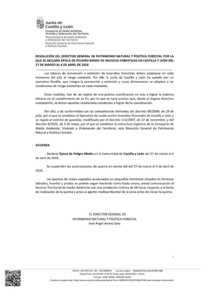 🚨🌲 AVISO IMPORTANTE – RIESGO DE INCENDIOS 🌲🚨La Junta de Castilla y León declara Época de Peligro Medio de Incendios Forestales 🔥📅 Fechas: del 27…